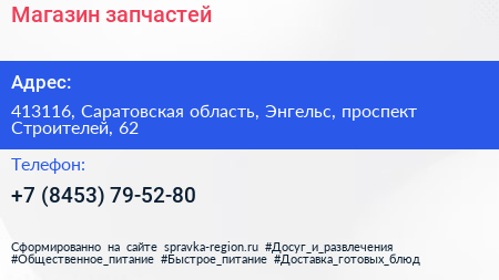 Магазин запчастей по адресу 413116, Саратовская область, Энгельс, проспект Строителей, 62 в дальнейшем Организация, размещена в следующих категориях: