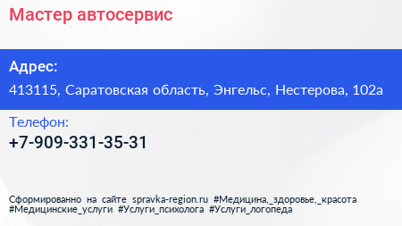 Мастер, автосервис по адресу 413115, Саратовская область, Энгельс, Нестерова, 102а в дальнейшем Организация, размещена в следующих категориях: