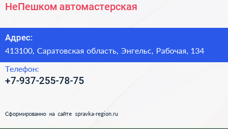 НеПешком, автомастерская по адресу 413100, Саратовская область, Энгельс, Рабочая, 134 в дальнейшем Организация, размещена в следующих категориях: