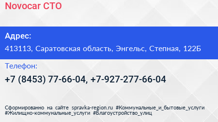 Novocar, СТО по адресу 413113, Саратовская область, Энгельс, Степная, 122Б в дальнейшем Организация, размещена в следующих категориях: