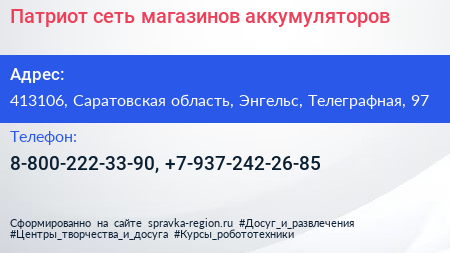 Патриот, сеть магазинов аккумуляторов по адресу 413106, Саратовская область, Энгельс, Телеграфная, 97 в дальнейшем Организация, размещена в следующих категориях: