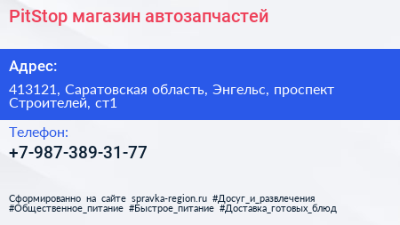 PitStop, магазин автозапчастей по адресу 413121, Саратовская область, Энгельс, проспект Строителей, ст1 в дальнейшем Организация, размещена в следующих категориях: