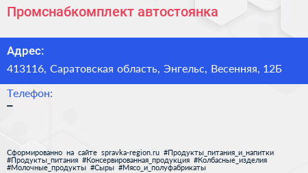 Промснабкомплект, автостоянка по адресу 413116, Саратовская область, Энгельс, Весенняя, 12Б в дальнейшем Организация, размещена в следующих категориях: