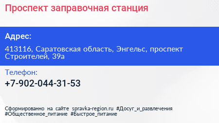 Проспект, заправочная станция по адресу 413116, Саратовская область, Энгельс, проспект Строителей, 39а в дальнейшем Организация, размещена в следующих категориях:
