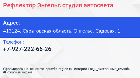 Рефлектор-Энгельс, студия автосвета по адресу 413124, Саратовская область, Энгельс, Садовая, 1 в дальнейшем Организация, размещена в следующих категориях: