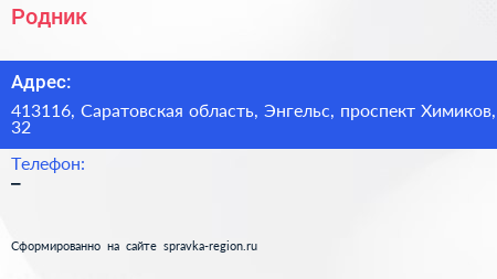 Родник по адресу 413116, Саратовская область, Энгельс, проспект Химиков, 32 в дальнейшем Организация, размещена в следующих категориях: