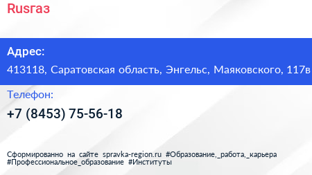 Rusгаз по адресу 413118, Саратовская область, Энгельс, Маяковского, 117в в дальнейшем Организация, размещена в следующих категориях: