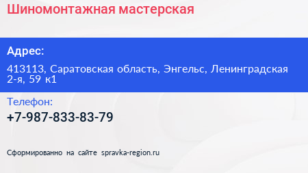 Шиномонтажная мастерская по адресу 413113, Саратовская область, Энгельс, Ленинградская 2-я, 59 к1 в дальнейшем Организация, размещена в следующих категориях: