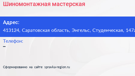 Шиномонтажная мастерская по адресу 413124, Саратовская область, Энгельс, Студенческая, 147а в дальнейшем Организация, размещена в следующих категориях: