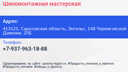 Шиномонтажная мастерская по адресу 413121, Саратовская область, Энгельс, 148 Черниговской Дивизии, 25Б в дальнейшем Организация, размещена в следующих категориях: