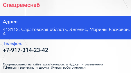 Спецремснаб по адресу 413113, Саратовская область, Энгельс, Марины Расковой, 4 в дальнейшем Организация, размещена в следующих категориях: