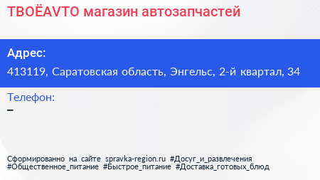 ТВОЁAVTO, магазин автозапчастей по адресу 413119, Саратовская область, Энгельс, 2-й квартал, 34 в дальнейшем Организация, размещена в следующих категориях: