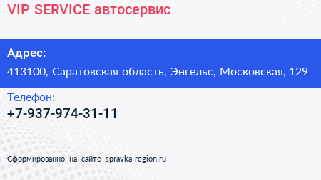VIP SERVICE, автосервис по адресу 413100, Саратовская область, Энгельс, Московская, 129 в дальнейшем Организация, размещена в следующих категориях: