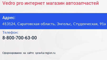 Vedro.pro, интернет-магазин автозапчастей по адресу 413124, Саратовская область, Энгельс, Студенческая, 91а в дальнейшем Организация, размещена в следующих категориях: