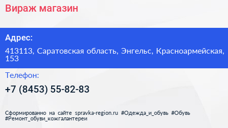 Вираж, магазин по адресу 413113, Саратовская область, Энгельс, Красноармейская, 153 в дальнейшем Организация, размещена в следующих категориях: