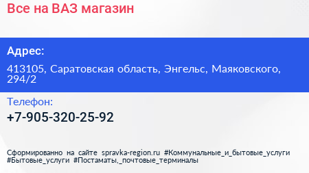 Все на ВАЗ, магазин по адресу 413105, Саратовская область, Энгельс, Маяковского, 294/2 в дальнейшем Организация, размещена в следующих категориях: