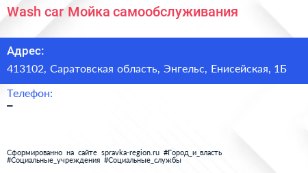Wash car, Мойка самообслуживания по адресу 413102, Саратовская область, Энгельс, Енисейская, 1Б в дальнейшем Организация, размещена в следующих категориях: