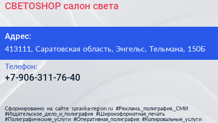 СВЕТОSHOP, салон света по адресу 413111, Саратовская область, Энгельс, Тельмана, 150Б в дальнейшем Организация, размещена в следующих категориях: