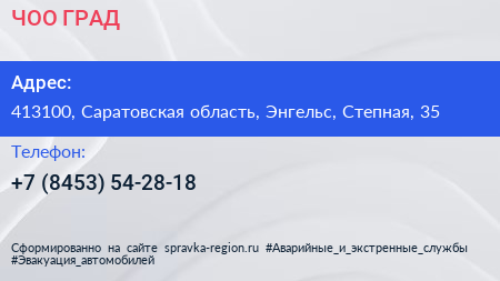 ЧОО ГРАД по адресу 413100, Саратовская область, Энгельс, Степная, 35 в дальнейшем Организация, размещена в следующих категориях: