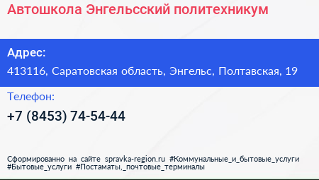 Автошкола, Энгельсский политехникум по адресу 413116, Саратовская область, Энгельс, Полтавская, 19 в дальнейшем Организация, размещена в следующих категориях: