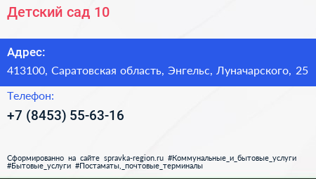 Детский сад №10 по адресу 413100, Саратовская область, Энгельс, Луначарского, 25 в дальнейшем Организация, размещена в следующих категориях: