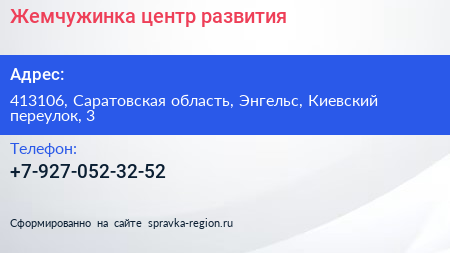 Жемчужинка, центр развития по адресу 413106, Саратовская область, Энгельс, Киевский переулок, 3 в дальнейшем Организация, размещена в следующих категориях: