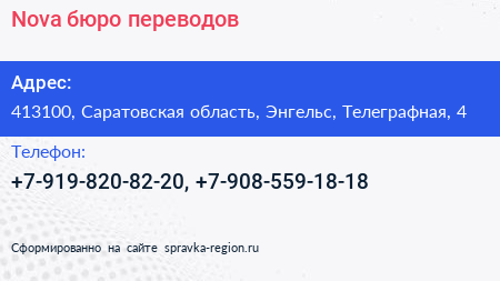 Nova, бюро переводов по адресу 413100, Саратовская область, Энгельс, Телеграфная, 4 в дальнейшем Организация, размещена в следующих категориях: