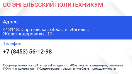 СО ЭНГЕЛЬССКИЙ ПОЛИТЕХНИКУМ по адресу 413118, Саратовская область, Энгельс, Железнодорожная, 13 в дальнейшем Организация, размещена в следующих категориях: