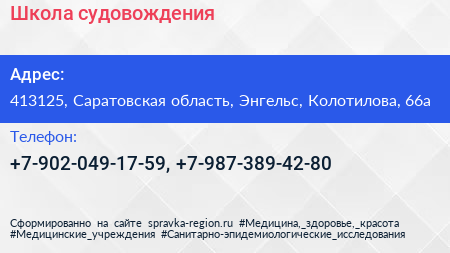 Школа судовождения по адресу 413125, Саратовская область, Энгельс, Колотилова, 66а в дальнейшем Организация, размещена в следующих категориях: