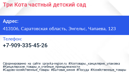 Три Кота, частный детский сад по адресу 413106, Саратовская область, Энгельс, Чапаева, 123 в дальнейшем Организация, размещена в следующих категориях: