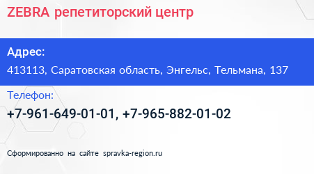 ZEBRA, репетиторский центр по адресу 413113, Саратовская область, Энгельс, Тельмана, 137 в дальнейшем Организация, размещена в следующих категориях: