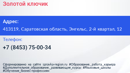 Золотой ключик по адресу 413119, Саратовская область, Энгельс, 2-й квартал, 12 в дальнейшем Организация, размещена в следующих категориях: