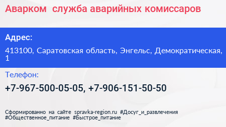 Аварком+, служба аварийных комиссаров по адресу 413100, Саратовская область, Энгельс, Демократическая, 1 в дальнейшем Организация, размещена в следующих категориях: