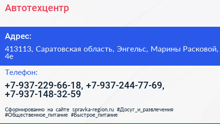 Автотехцентр по адресу 413113, Саратовская область, Энгельс, Марины Расковой, 4е в дальнейшем Организация, размещена в следующих категориях: