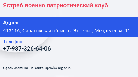 Ястреб, военно-патриотический клуб по адресу 413116, Саратовская область, Энгельс, Менделеева, 11 в дальнейшем Организация, размещена в следующих категориях: