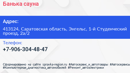 Банька, сауна по адресу 413124, Саратовская область, Энгельс, 1-й Студенческий проезд, 2а/2 в дальнейшем Организация, размещена в следующих категориях: