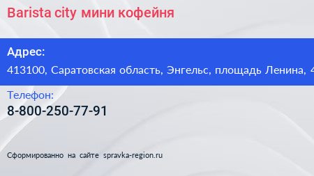 Barista city, мини-кофейня по адресу 413100, Саратовская область, Энгельс, площадь Ленина, 4 в дальнейшем Организация, размещена в следующих категориях: