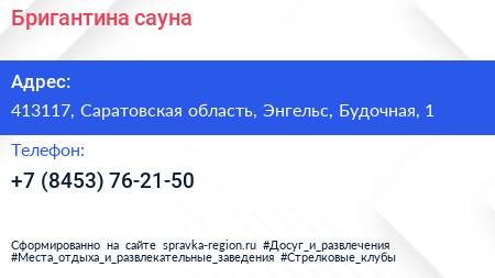 Бригантина, сауна по адресу 413117, Саратовская область, Энгельс, Будочная, 1 в дальнейшем Организация, размещена в следующих категориях: