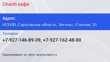 Chanti, кафе по адресу 413100, Саратовская область, Энгельс, Степная, 35 в дальнейшем Организация, размещена в следующих категориях: