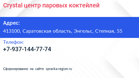Crystal, центр паровых коктейлей по адресу 413100, Саратовская область, Энгельс, Степная, 55 в дальнейшем Организация, размещена в следующих категориях:
