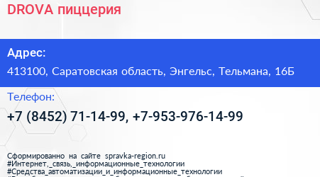DROVA, пиццерия по адресу 413100, Саратовская область, Энгельс, Тельмана, 16Б в дальнейшем Организация, размещена в следующих категориях: