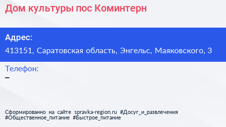 Дом культуры, пос. Коминтерн по адресу 413151, Саратовская область, Энгельс, Маяковского, 3 в дальнейшем Организация, размещена в следующих категориях: