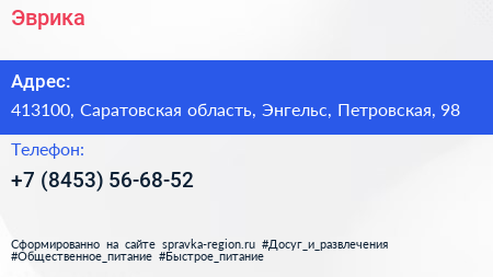 Эврика по адресу 413100, Саратовская область, Энгельс, Петровская, 98 в дальнейшем Организация, размещена в следующих категориях: