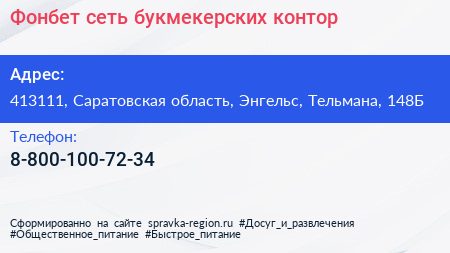 Фонбет, сеть букмекерских контор по адресу 413111, Саратовская область, Энгельс, Тельмана, 148Б в дальнейшем Организация, размещена в следующих категориях: