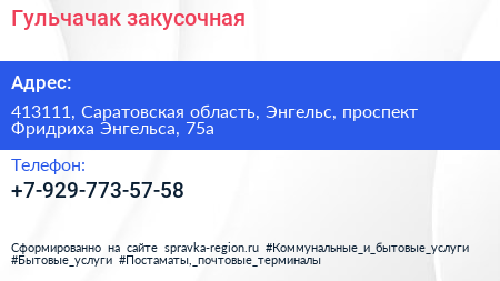 Гульчачак, закусочная по адресу 413111, Саратовская область, Энгельс, проспект Фридриха Энгельса, 75а в дальнейшем Организация, размещена в следующих категориях: