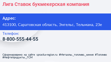 Лига Ставок, букмекерская компания по адресу 413100, Саратовская область, Энгельс, Тельмана, 23е в дальнейшем Организация, размещена в следующих категориях: