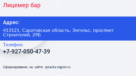 Лицемер, бар по адресу 413121, Саратовская область, Энгельс, проспект Строителей, 29Б в дальнейшем Организация, размещена в следующих категориях:
