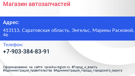 Магазин автозапчастей по адресу 413113, Саратовская область, Энгельс, Марины Расковой, 4е в дальнейшем Организация, размещена в следующих категориях:
