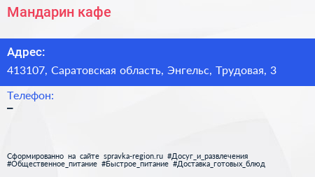 Мандарин, кафе по адресу 413107, Саратовская область, Энгельс, Трудовая, 3 в дальнейшем Организация, размещена в следующих категориях: