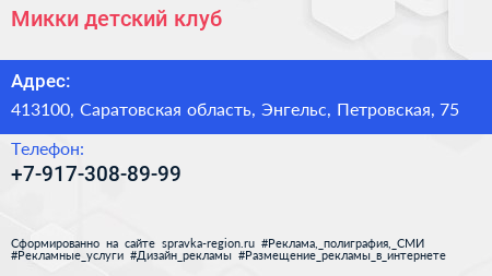 Микки, детский клуб по адресу 413100, Саратовская область, Энгельс, Петровская, 75 в дальнейшем Организация, размещена в следующих категориях: